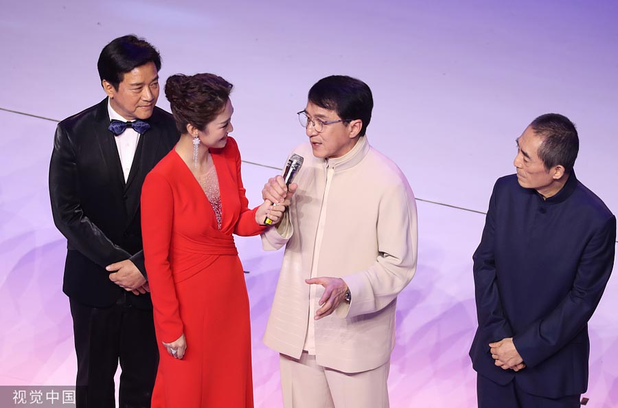 Actor Jackie Chan (second from right) and director Zhang Yimou (right) attend the opening of the 28th Golden Rooster and Hundred Flowers Film Festival, Nov 19, 2019. [Photo/VCG]