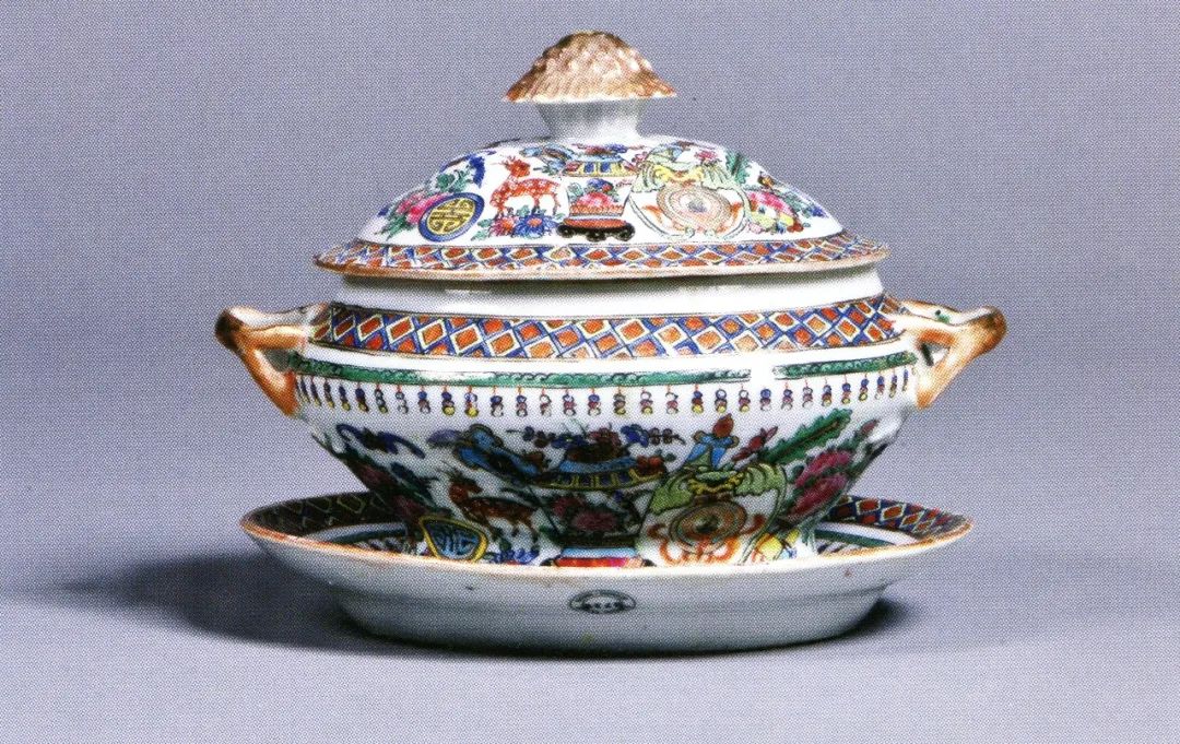 Lidded Canton polychrome porcelain tureen with coat-of-arm and Chinese antiques ( bogu) patterns, Xuantong reign (1909-1911) of the Qing Dynasty [Photo/Official WeChat account of the Guangzhou Museum]