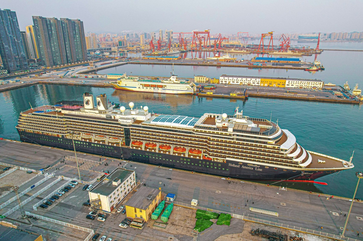 The international cruise ship "Zuiderdam" docked at the Dalian Port cruise terminal on Sunday morning, bringing visitors from around the world for a day of exploration in Dalian, Liaoning province.