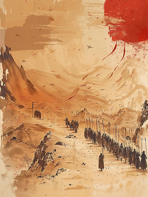 This AI illustration is inspired by the Tang Dynasty (618-907) poem On Mission To The Frontier written by Wang Wei (701-761). The grandeur and majesty of the frontier desert are depicted. Additionally, the AI illustrates the scene of an army trudging through the boundless desert, amidst endless yellow sand.