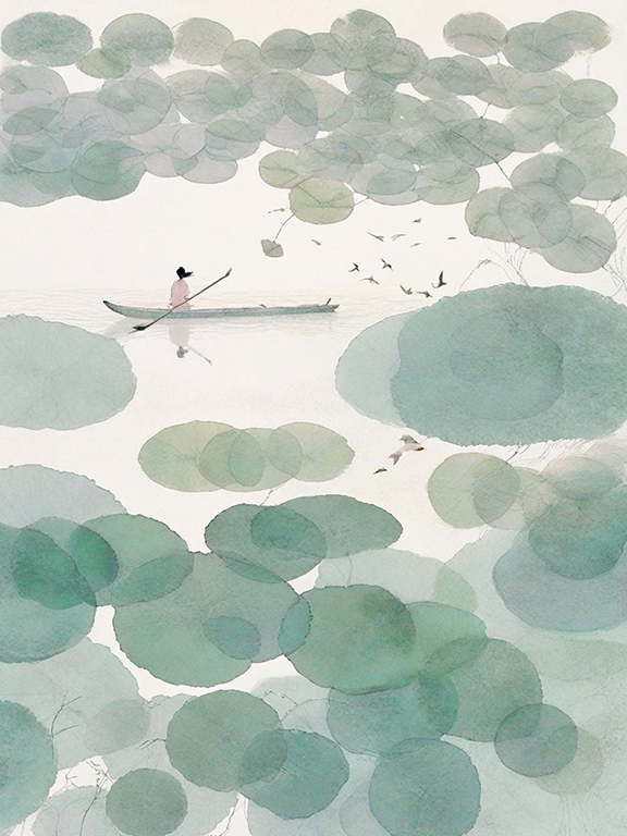 This group of illustrations is inspired by the Song Dynasty (960-1279) poem Like a Dream Verse: Often Recall Creek-Side Pavilion at Dusk written by Li Qingzhao (1085-1155). The overall tone of the illustrations is fresh and elegant. The blank space on the water surface contrasts sharply with the dense lotus leaves, creating a visual contrast between emptiness and solidity. This balance appears natural and breathable, evoking a sense of comfort and offering ample room for imagination. The exaggerated technique of enlarging the lotus leaves while reducing the size of the human figure creates a sense of oppression, highlighting the anxiety of "straying deep into the lotus flowers" and the depth and lushness of the leaves.