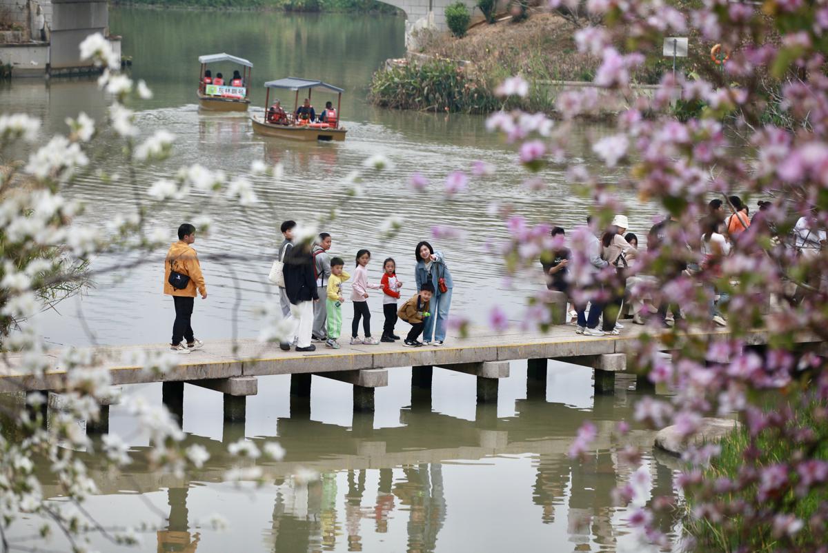 Along a 3.2-kilometer road inside the Haizhu Wetland, a national-level wetland park in the city's Haizhu district, bauhinia trees are blooming right on schedule, forming a white and pink flower sea.