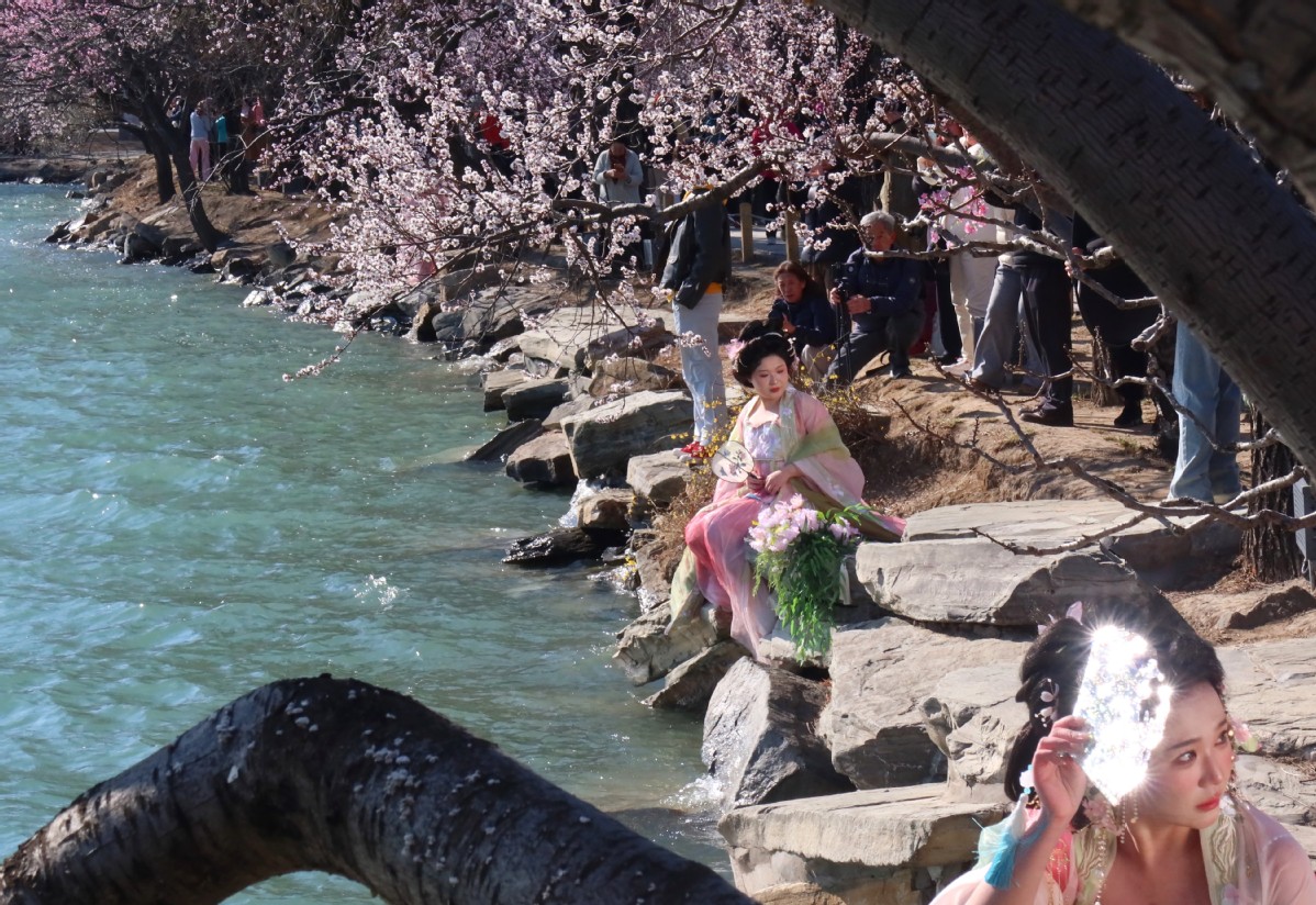 take pictures among blossoms at the Summer Palace in Beijing on March 16, 2025. [Photo by Jiang Dong/chinadaily.com.cn]
