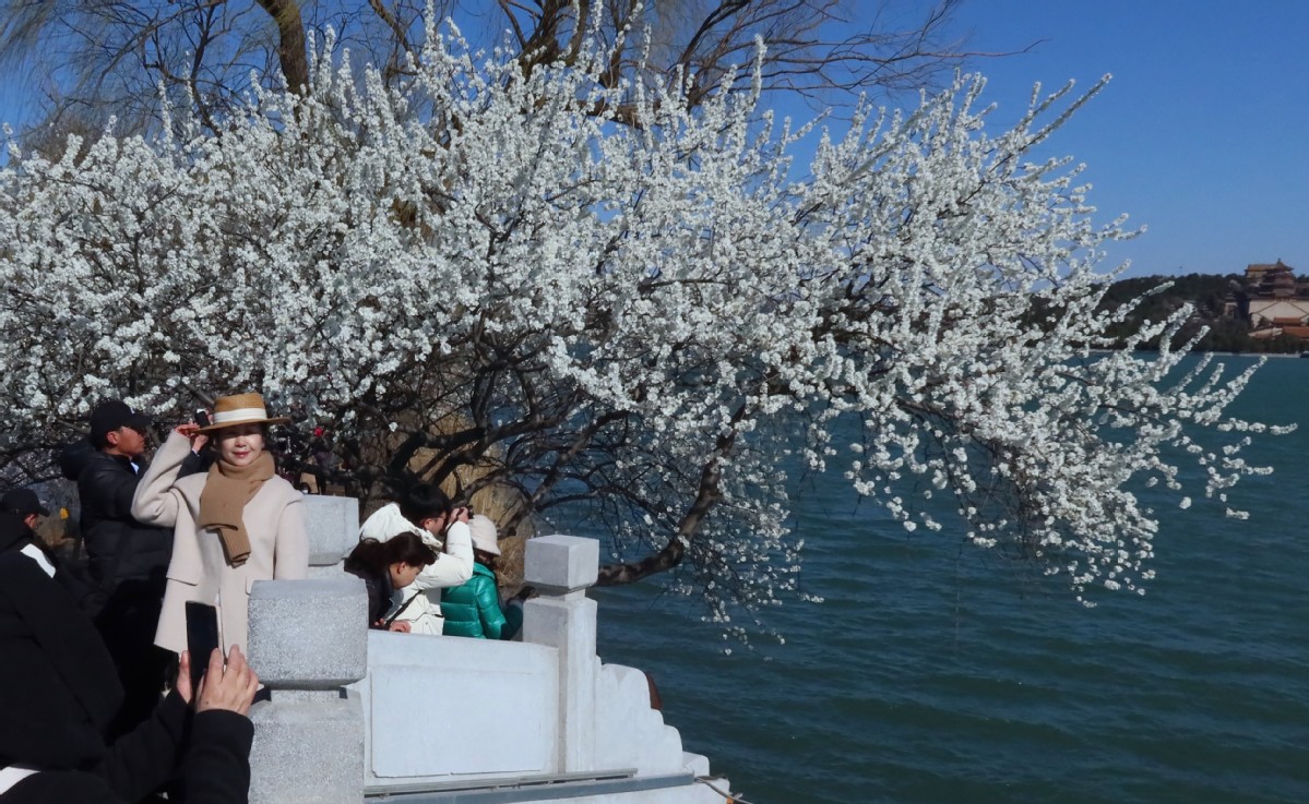 Tourists take pictures among blossoms at the Summer Palace in Beijing on March 16, 2025. [Photo by Jiang Dong/chinadaily.com.cn]