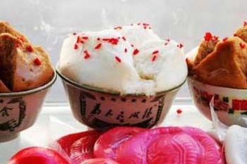 Wan'er cakes appeared and grew in popularity in the 1980s. The cakes are often snowy white made from rice or red-violet or blackish made from broomcorn and buckwheat.