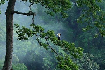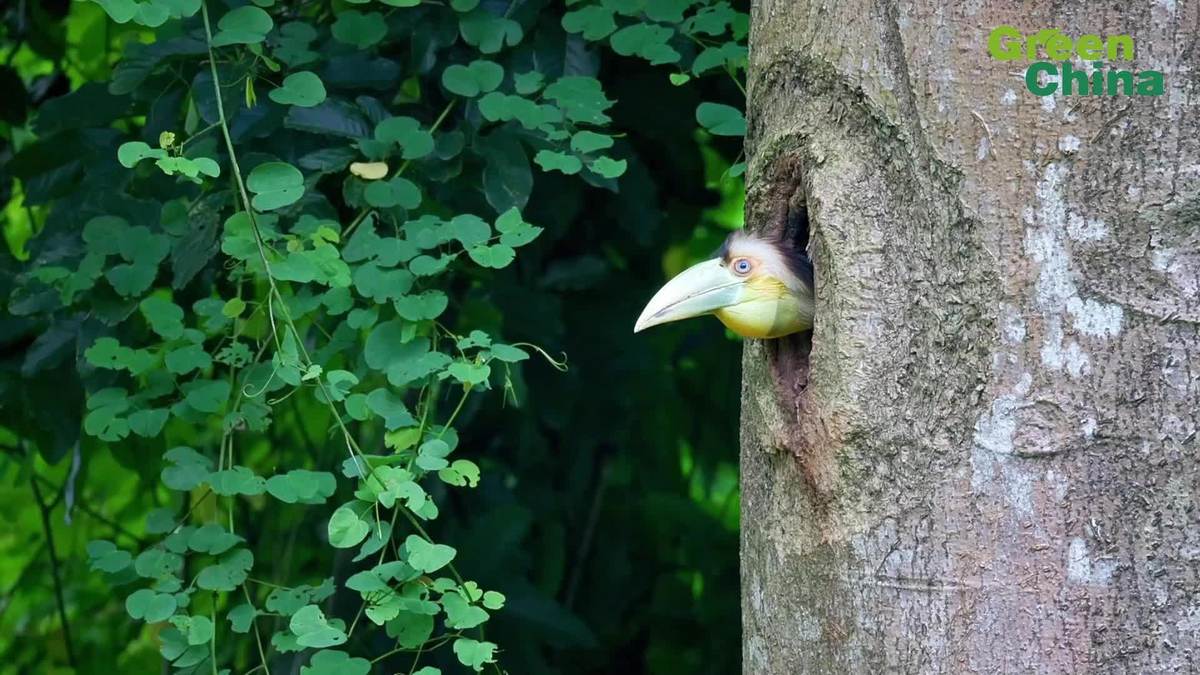 Baby wreathed hornbill and its mother leaving their nest in Yunnan