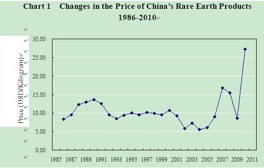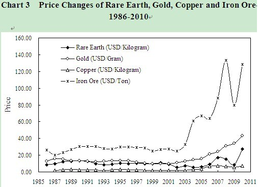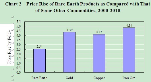 - Severe divergence between price and value. Over quite a long period of time, the price of rare earth products has remained low and failed to reflect their value, the scarcity of the resources has not been appropriately represented, and the damage to the ecological environment has not been properly compensated for. Since the second half of 2010, despite the gradual rise in the price of rare earth products, the rise has been much lower than that in the price rise of other raw materials like gold, copper and iron ore. From 2000 to 2010, the price of rare earth products rose by 2.5-fold, while that of gold, copper and iron ore increased by 4.4-, 4.1-, and 4.8-fold during the same period, respectively.