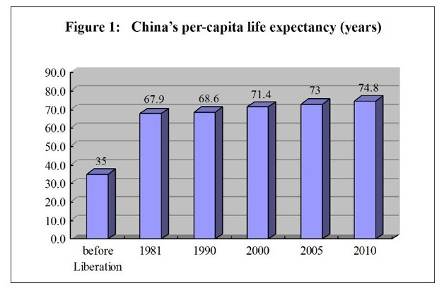 The people's health has been improved. Judging from important indicators that give expression to national health, the health of the Chinese people is now among the top in developing countries. In 2010, the life expectancy was 74.8 years - 72.4 years for males and 77.4 years for females; the maternal mortality rate went down from 51.3 per 100,000 in 2002 to 26.1 per 100,000 in 2011; the infant mortality rate and the mortality rate of children under the age of five have kept dropping, with the former going down from 29.2 per thousand in 2002 to 12.1 per thousand in 2011, and the latter, from 34.9 per thousand to 15.6 per thousand, attaining ahead of schedule the UN Millennium Development Goal in this regard.