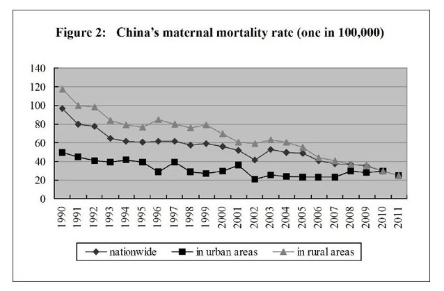 Medical and Health Services in China-Figure 2: China's maternal mortality rate (one in 100,000) from 1990 to 2011, according to a white paper released by the Information Office of the State Council on Dec. 26, 2012. (Xinhua)