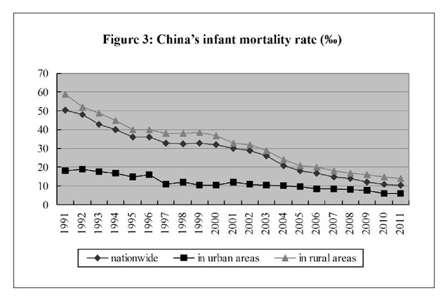 Medical and Health Services in China-Figure 3: China's infant mortality rate from 1991 to 2011, according to a white paper released by the Information Office of the State Council on Dec. 26, 2012. (Xinhua)