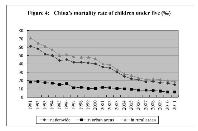 Medical and Health Services in China-Figure 4: China's mortality rate of children under five years of age from 1991 to 2011, according to a white paper released by the Information Office of the State Council on Dec. 26, 2012. (Xinhua)