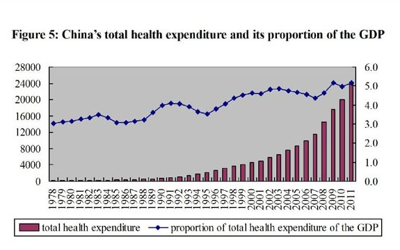 Medical and Health Services in China-Figure 5: China's total health expenditure and its proportion of the GDP from 1978 to 2011, according to a white paper released by the Information Office of the State Council on Dec. 26, 2012. (Xinhua)