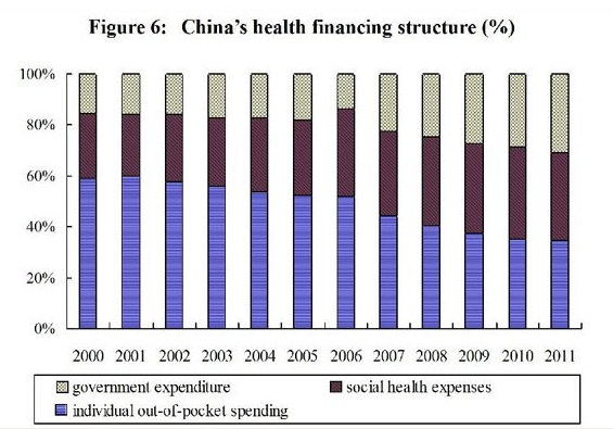 Medical and Health Services in China-Figure 6: China's health financing structure (%) from 2000 to 2011, according to a white paper released by the Information Office of the State Council on Dec. 26, 2012. (Xinhua)