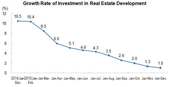 The total investment in real estate development in 2015 was 9.59 trillion yuan($1540.98 billion), a nominal increase of 1.0 percent year-on-year (the real growth rate was 2.8 percent, after deducting price factors), a decline of 0.3 percent over the first eleven months. The investment in residential buildings was 6.46 trillion yuan, up by 0.4 percent, a 0.3 percentage points lower rate of increase, and accounted for 67.3 percent of real estate development investment.