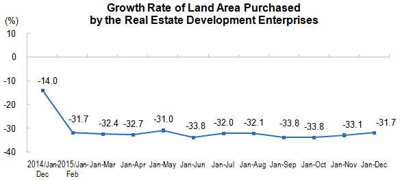 In 2015, the land area purchased by real estate development enterprises totaled 228.11 million square meters, a year-on-year decrease of 31.7 percent, and the pace of decrease narrowed by 1.4 percentage points over the first eleven months. The total transaction of land reached 762.2 billion yuan, a decrease of 23.9 percent, and the pace of decrease narrowed by 2.1 percentage points.