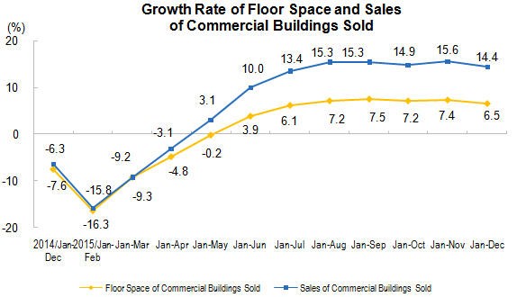 In 2015, the floor space of commercial buildings sold stood at 1.28 billion square meters, a year-on-year increase of 6.5 percent, and a decrease of 0.9 percentage points over the first eleven months. The floor space of residential buildings increased 6.9 percent, office building space increased 16.2 percent, and buildings for business use increased 1.9 percent. The sales of commercial buildings amounted to 8.73 billion yuan, an increase of 14.4 percent, and a rate decline of 1.2 percentage points. Specifically, the sales of residential buildings went up by 16.6 percent, office buildings were up by 26.9 percent, and buildings for commercial businesses were down by 0.7 percent.