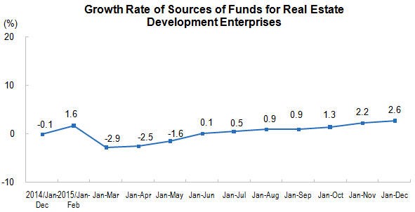 In 2015, the sources of funds for real estate development enterprises reached 12.52 trillion yuan, up by 2.6 percent year-on-year, and an increase of 0.4 percent over the first eleven months. Specifically, domestic loans stood at 2.02 tillion yuan, lower by 4.8 percent, foreign investment stood at 29.7 billion yuan, down by 53.6 percent, self-raising funds stood at 4.91 trillion yuan, down by 2.7 percent, and other sources stood at 5.57 trillion yuan, up by 12.0 percent. Among the other sources of funds, deposits and advance payments totaled 3.25 trillion yuan, an increase of 7.5 percent, while personal mortgage loans totaled 1.67 trillion yuan, up by 21.9 percent.