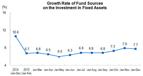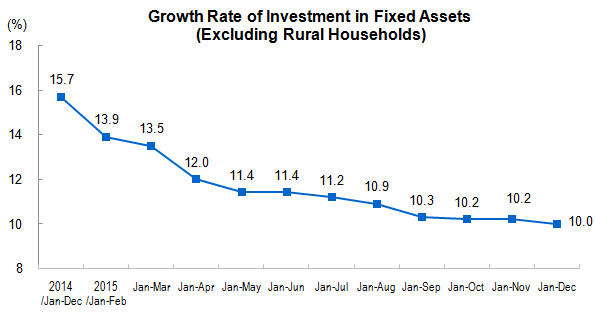 In 2015, investment in fixed assets (excluding rural households) reached 55.16 trillion yuan($8.86 trillion), up by 10.0 percent year-on-year in nominal terms (the real growth rate was 12.0 percent, after deducting price factors), and the growth rate was 0.2 percentage points lower over the first eleven months. In December, investment in fixed assets (excluding rural households) increased 0.68 percent month-on-month.