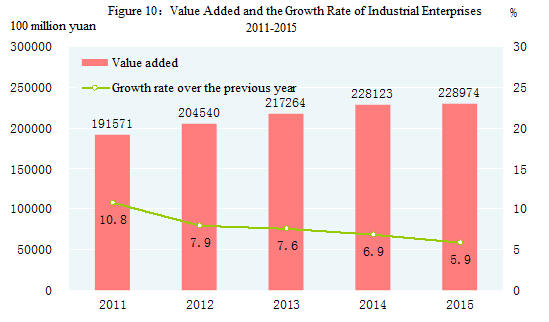 In 2015, the total value added of the industrial sector was 22.90 trillion yuan ($3.68 trillion), a rise of 5.9 percent from the previous year. The value added of industrial enterprises above designated size increased by 6.1 percent.