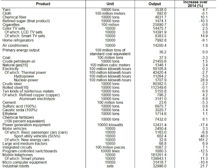 In 2015, of the industrial enterprises above designated size, the value added for agricultural product food processing was up by 5.5 percent from the previous year; for the textile industry it was up by 7.0 percent; for the manufacturing of raw chemical materials and chemical products, it was up by 9.5 percent; for the manufacturing of non-metallic mineral products, it was up by 6.5 percent; for smelting and pressing of non-ferrous metals, it was up by 5.4 percent; for the manufacturing of general machinery, it was up by 2.9 percent; for the manufacturing of special purpose machinery, it was up by 3.4 percent; for the manufacturing of automobiles, it was up by 6.7 percent; for the manufacturing of electrical machinery and equipment, it was up by 7.3 percent; for the manufacturing of computers, communication equipment and other electronic equipment, it was up by 10.5 percent; and for the production and supply of electricity and heat power, it was up by 0.5 percent.