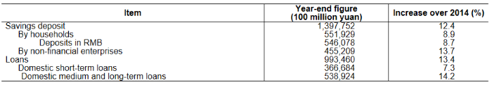 In 2015, the increase in social financing reached 15.4 trillion yuan, a drop of 467.5 billion yuan from 2014 on a comparable basis. Savings deposits in Renminbi and foreign currencies in all branches of financial institutions totaled 139.8 trillion yuan at the end of 2015, an increase of 15.3 trillion yuan. Of this total, savings deposits in Renminbi stood at 135.7 trillion yuan, an increase of 15.0 trillion yuan. Loans in Renminbi and foreign currencies in all branches of financial institutions reached 99.3 trillion yuan, an increase of 11.7 trillion yuan. Of this total, loans in Renminbi were 94.0 trillion yuan, an increase of 11.7 trillion yuan.