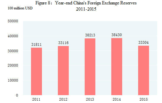 At the end of 2015, China’s foreign exchange reserves reached $3.33 trillion, a decrease of $512.7 billion compared with the end of 2014. The average exchange rate of the year was 6.2284 RMB to 1 USD, a depreciation of 1.4 percent from 2014.