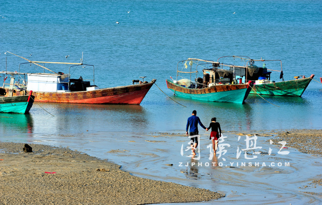 As the tide goes out, a couple steal their chance to wade in the shallows. [Photo by Weng Wen/yinsha.com]