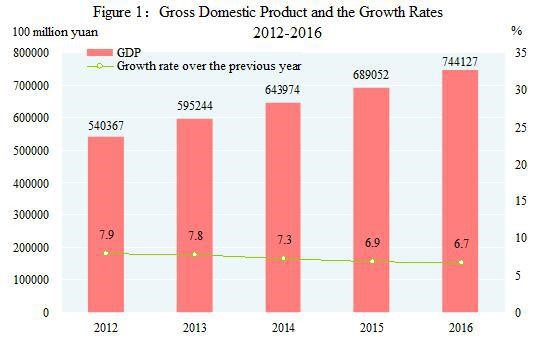 According to preliminary accounting, the gross domestic product (GDP) in 2016 was 74,412.7 billion yuan ($11.61 trillion), up by 6.7 percent over the previous year.