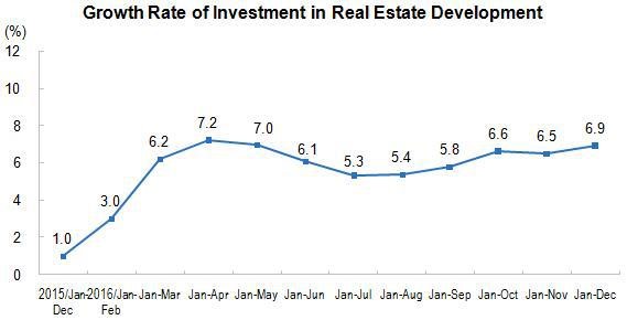 The total investment in real estate development in 2016 was 10.26 trillion yuan($1544.34 billion), a nominal increase of 6.9 percent year-on-year (the real growth rate was 7.5 percent, after deducting price factors), 0.4 percentage points higher over the first eleven months. The investment in residential buildings was 6.87 trillion yuan, up by 6.4 percent, a 0.4 percentage points higher rate of increase, and accounted for 67.0 percent of real estate development investment.