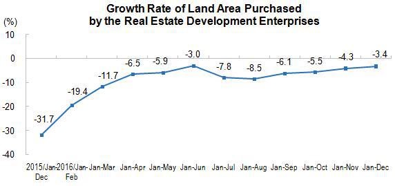 In 2016, the land area purchased by real estate development enterprises totaled 220.25 million square meters, a decrease of 3.4 percent over last year, and the pace of decline narrowed by 0.9 percentage points over the first eleven months. The total transaction of land reached 912.9 billion yuan, increased 19.8 percent, and the growth rate dropped by 1.6 percentage points.
