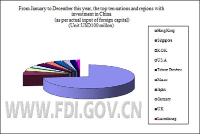 From January to December, the top ten nations and regions with investment in China (as per the actual input of foreign capital) were as follows: Hong Kong (USD87.18b), Singapore (USD6.18b) , R.O.K.(USD4.75b), U.S.A. (USD3.83b), Taiwan province(USD3.62b), Macao(USD3.48b), Japan (USD3.11b), Germany(USD2.71b), the U.K.(USD2.21b) and Luxembourg (USD1.39b). The total of actual investment input from these sources accounted for 94 percent of the total of actually input foreign or regional investment in the country.
