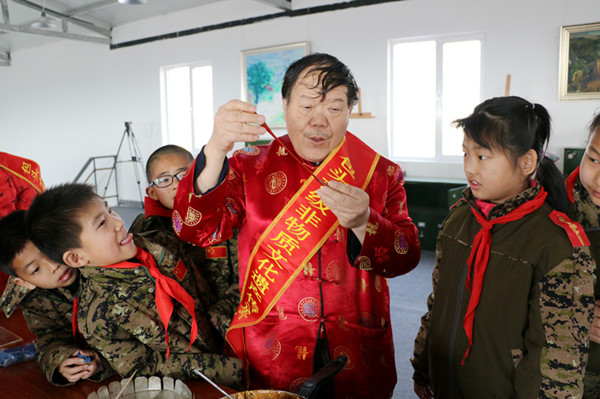 Students learn about the sugar-figure blowing art, Feb 20. Sugar-figure blowing is a traditional Chinese folk art. The sugar-figure blowers first heat the sugar up to the appropriate temperature, and then knead it into a ball. They use their fingers to press a deep hole into the ball, and then pull their fingers out along with the sugar until the sugar is very thin. At this moment, they break off the sugar stick and blow air into the sugar to make it into molds. Lastly, the folk artists make the molds into different shapes. [Photo/Federation of Literary and Art Circles of Qingshan district]