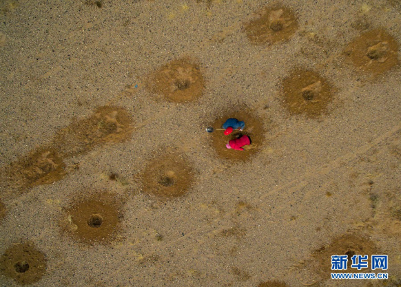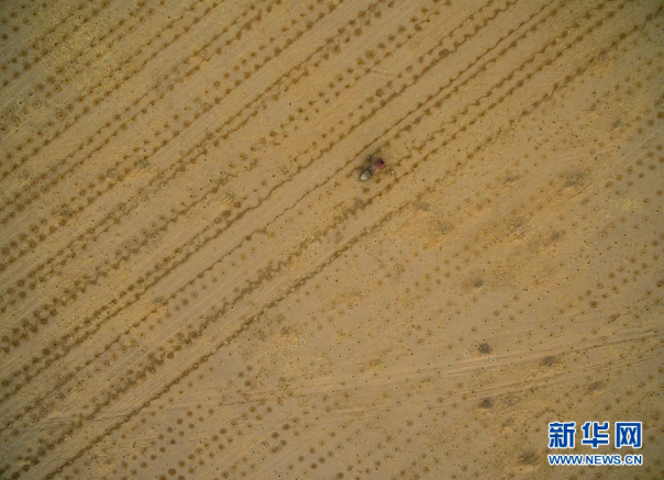A photo taken on March 20 shows a bird’s-eye view of planting holes for saxaul trees. [Photo/Xinhua] |