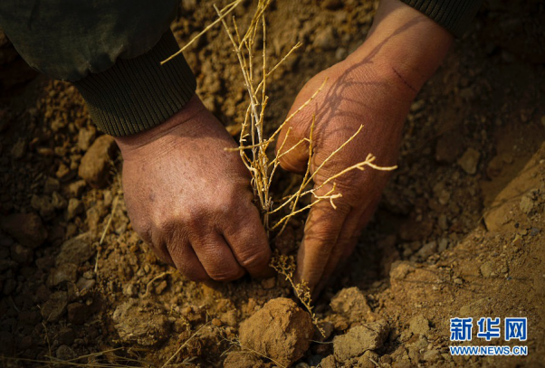 Nie plants a saxaul tree. [Photo/Xinhua] |