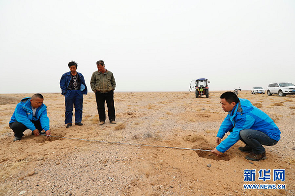 Pang Zongping (right), director of the desertification control center of Alxa SEE Foundation, and his colleague Yang Jun (left) check the spacing of two planting holes. [Photo/Xinhua] |