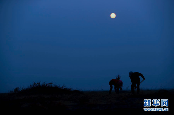 | Local workers plant saxaul trees at dawn on March 20. [Photo/Xinhua] |