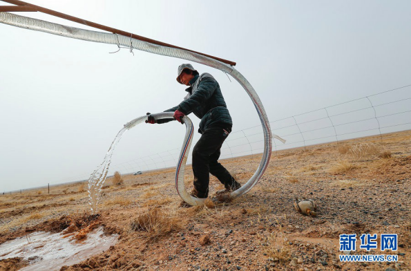 | A worker hired by Nie Yusheng waters saxaul trees. [Photo/Xinhua] |