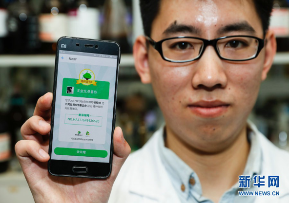 Wang presents his prompt message on his Ant Forest page for successfully cultivating a virtual tree that will become a registered saxaul tree in the desert. [Photo/Xinhua] |