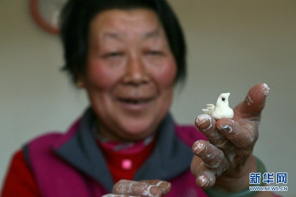 A villager holds a ball of dough shaped into a bird in Hohhot on April 1. [Photo/Xinhua]