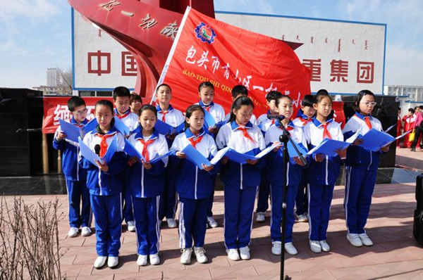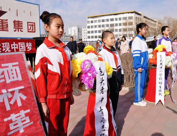 | Students from schools in Baotou lay flowers at the Monument of Wu Yunduo on April 2. Tomb Sweeping Day, or Qingming Festival, is a statutory public holiday in China which falls on the fourth or fifth day of the fourth lunar month each year. Activities on the day include visiting the columbarium, graves or burial grounds to pray for ancestors and honor martyrs. [Photo/bt.wenming.cn] |