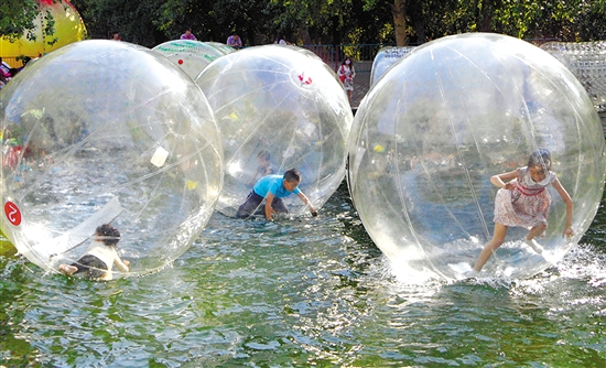 Children play in zorbs in a park in Baotou, Inner Mongolia autonomous region. The photo, titled Happy Times, is one of the works collected by Baotou Daily, and was taken by Guo Jianguo. [Photo/Baotou Daily] |