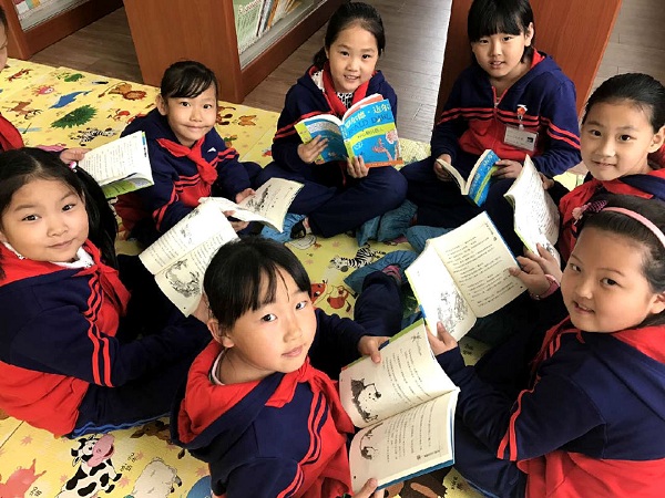 Students from Grade 3 and 4 read the Chinese version of Charlotte’s Web written by E. B. White. [Photo/nmgnews.com.cn]