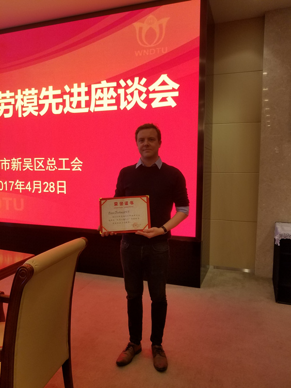 | Owen Fishwick from China Daily (Wuxi) is awarded as an outstanding foreign employee, April 28. [Photo/provided to chinadaily.com.cn] |