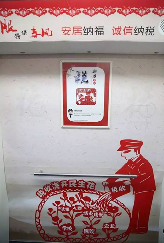 The metro carriage is decorated in paper cut designs depicting tax slogans. [Photo provided to chinadaily.com.cn] |