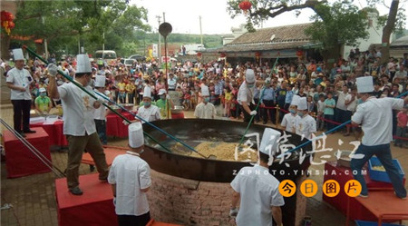 A bevy of chefs cook pineapple fried rice in a three-meter-wide pot at the closing ceremony of the Xuwen pineapple festival on April 30.[Photo by Luo Cheng/yinsha.com]
