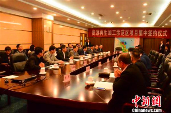 | The signing ceremony of seven circular economy projects is held at the Yantai Renewable Resource Processing Demonstration Zone on April 27. [Photo by Chuan Yi/Chinanews.cm] |