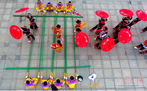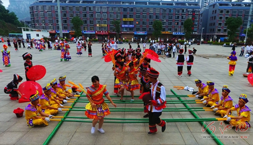 | Bamboo dancing is a popular dance that involves hopping over and between bamboo poles as they are manipulated by two to four people. [Photo by Gao Dongfeng/hcwang.cn] |