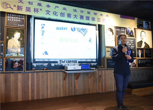 Gu Jianwei, founder of 3W café, the activity undertaker, introduces the rules of the 2017 "Xinwu Cup" Culture Creative Competition during the media conference on May 4. [Photo provided to chinadaily.com.cn] |