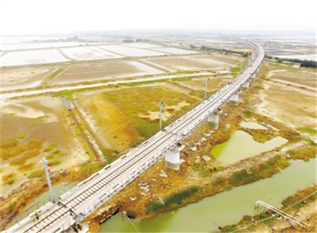The Donghai Island Railway, a crucial part of west Guangdong's coastal high-speed rail project, is laying track for an expansion project expected to complete this September.