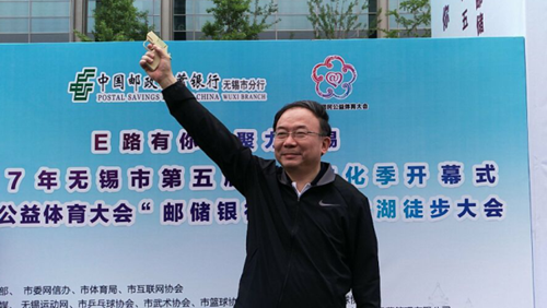 Li Xiaomin, a top Wuxi official, fires the starter's pistol for the 2017 Wuxi Taihu Lake Hike, May 7. [Photo/jstv.com]